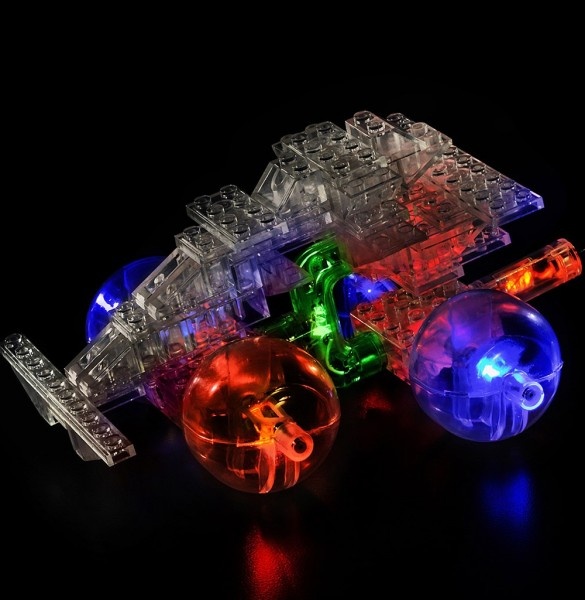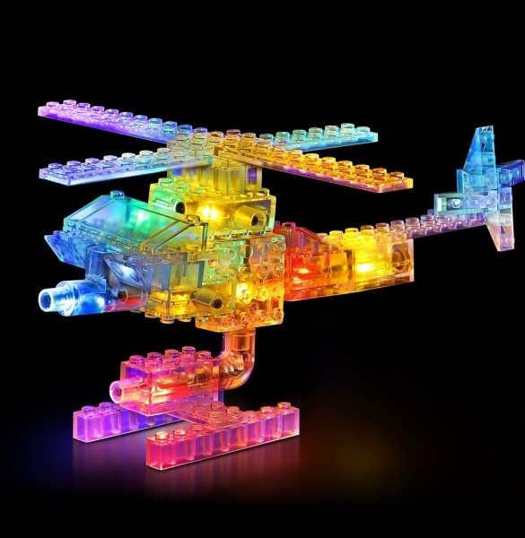 Набор состоит из множества стандартных деталей. Из них можно сделать вертолет, гоночную машину, спутник и другие интересные модели. Детали со светодиодами, которые входят в набор, сделают изделия более реалистичными, а также будут красиво светиться в темноте. Готовые модели можно будет использовать в качестве торшера для детской.