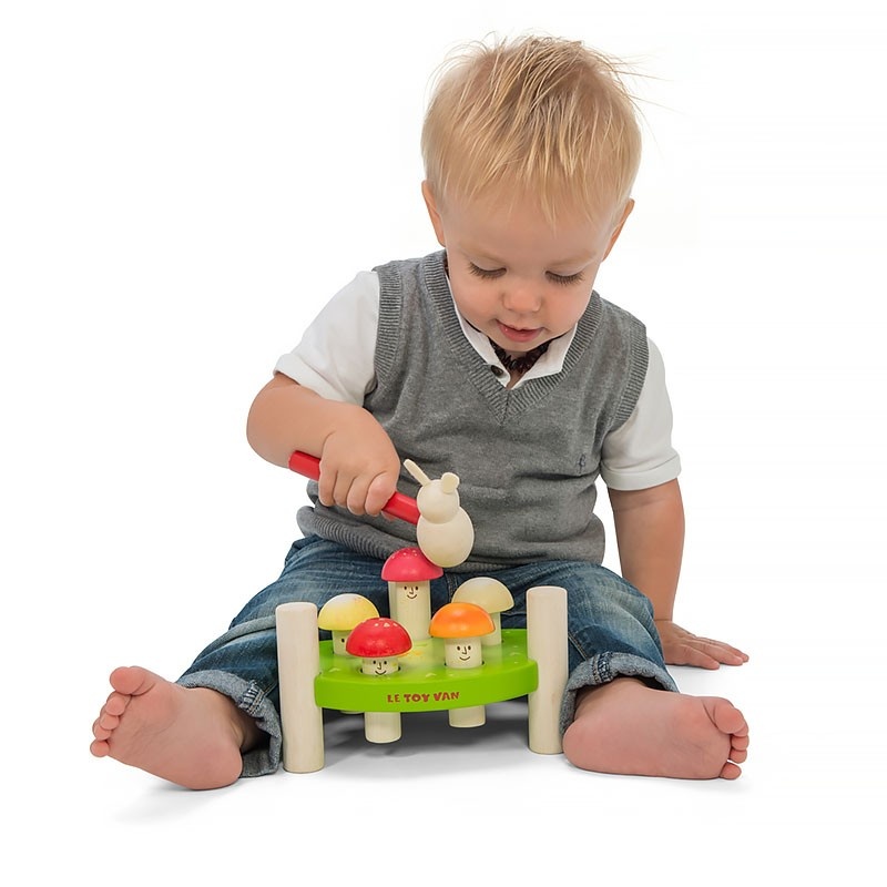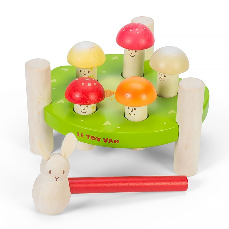Занимательная игрушка для малышей от 1 года выполнена в виде лесной лужайки, на которой выросли 5 грибов с большими шляпками. Они подмигивают малышу, подбадривая его, чтобы он смог попасть по ним молоточком в форме зайчика с удобной ручкой. Игрушка способствует развитию ловкости, глазомера и координации движений крохи.