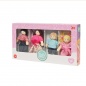 Кукла-дочь одета в наряд розового цвета пышную юбку и клетчатую кофточку, её длинные светлые волосы украшают бантики.