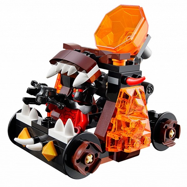 Магмометатель из набора Лего 70311 прекрасно разбирается в многообразии горных пород, составляющих вулканическую лаву. Применив свои знания на практике, он смог создать невероятную катапульту, сочетающую в себе маневренность и огневую мощь. Корпус катапульты, выполненный из деталей коричнево-чёрного цвета, напоминает голову подземного чудовища. В его открытой пасти располагается кабина водителя, прикрытая подвижными зубастыми челюстями и острыми шипами. По бокам от кабины видны прозрачные оранжевые стены, обладающие повышенной прочностью. На крыше установлено главное орудие, состоящее из пускового механизма, вместительной метательной чаши и лавовых боеприпасов. Чтобы во время сражений Магмометатель мог быстро перемещаться и вести прицельный огонь по королевским стражникам, катапульта оборудована усиленной подвеской и 4 колёсами, способными преодолевать любые ямы и овраги.