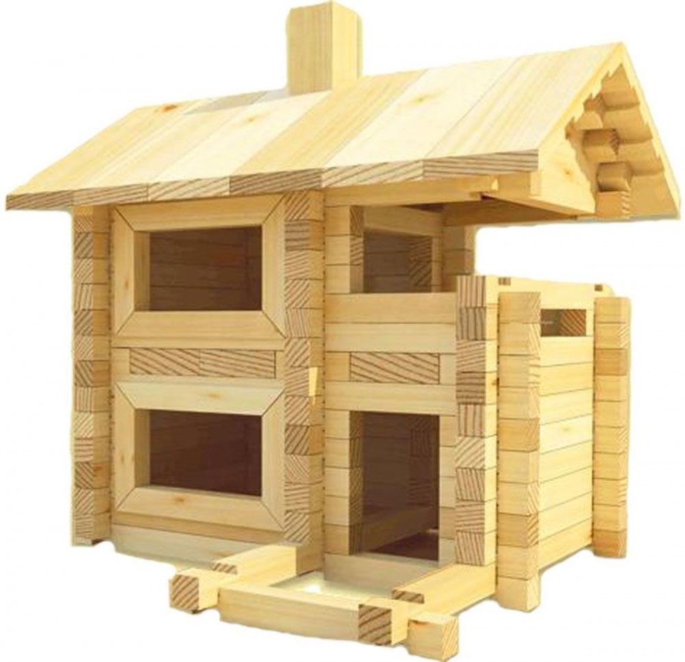 В комплекте: - 54 бруса длиной 3 см - 4 бруса длиной 9 см - 32 бруса длиной 13 см - 19 брусьев длиной 19 см - 2 фронтона крыши - 1 перекрытие - 2 полуперекрытия - 1 труба - 12 кровельных скатов - 2 оконные рамы большие - 1 оконная рама малая - инструкция по сборке различных вариантов домиков с поэтапными планами их постройки