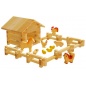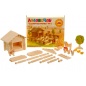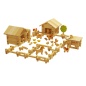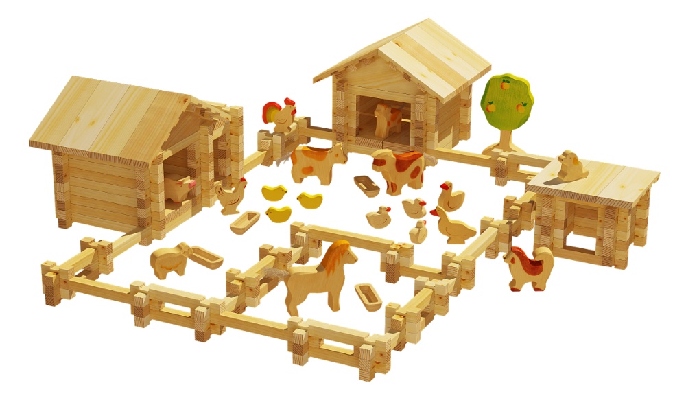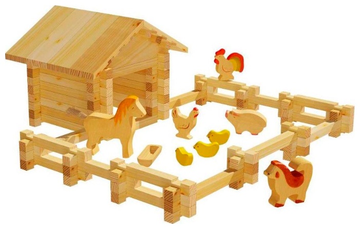 В комплекте: - 46 брусьев по 3 см - 10 брусьев по 9 см - 35 брусьев по 13 см - 2 большие треугольные детали для крыши - 8 стропил - 1 фигурка лошади - 1 фигурка свиньи - 1 фигурка собаки - 1 фигурка петуха - 1 фигурка курицы - 3 фигурки цыплят - 1 корыто