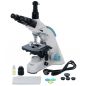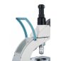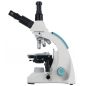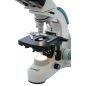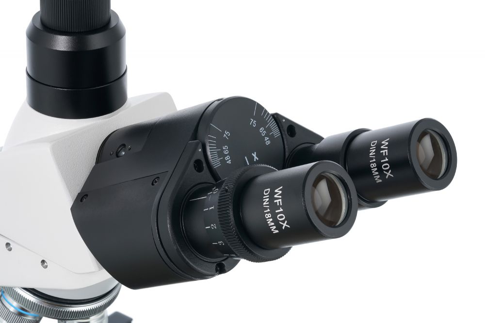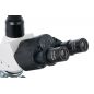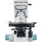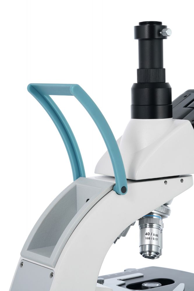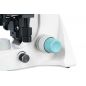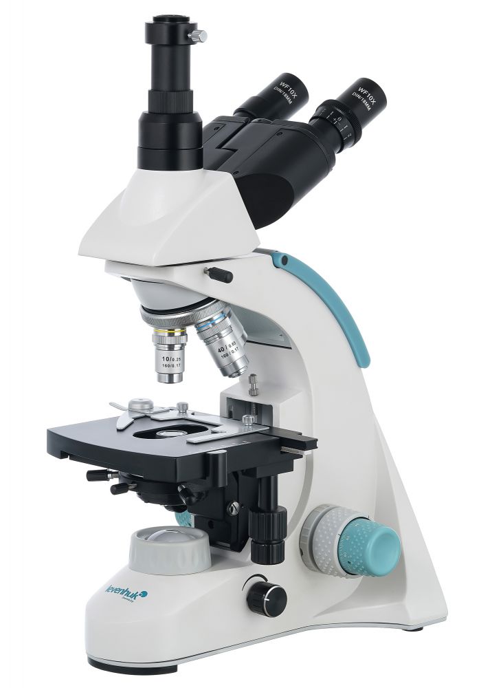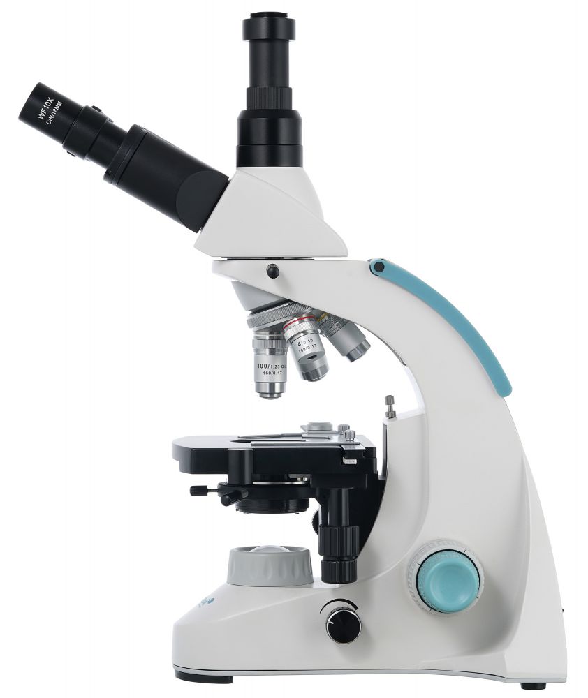 На микроскопе установлена поворотная тринокулярная насадка. В отдельно расположенную вертикальную трубку можно установить цифровую камеру (приобретается отдельно), чтобы выводить изображение на внешний экран и фотографировать образцы. Визуальный узел имеет небольшой наклон, что делает длительные наблюдения более комфортными. Широкопольные окуляры дают хороший обзор, а ахроматические объективы создают четкое и контрастное изображение по всему полю зрения. Увеличение оптики находится в диапазоне от 40 до 1000 крат. Объективы 40х и 100х снабжены защитными пружинящими оправами.