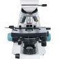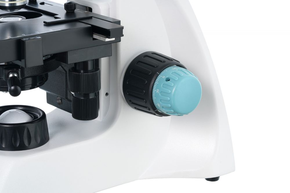 Прямо под револьверным устройством находится предметный столик с препаратоводителем. По обеим сторонам от него расположены ручки грубой и точной фокусировки. Система освещения находится внизу и состоит из конденсора Аббе с ирисовой диафрагмой и держателем фильтра, светодиода и коллектора. Яркость подсветки регулируется.