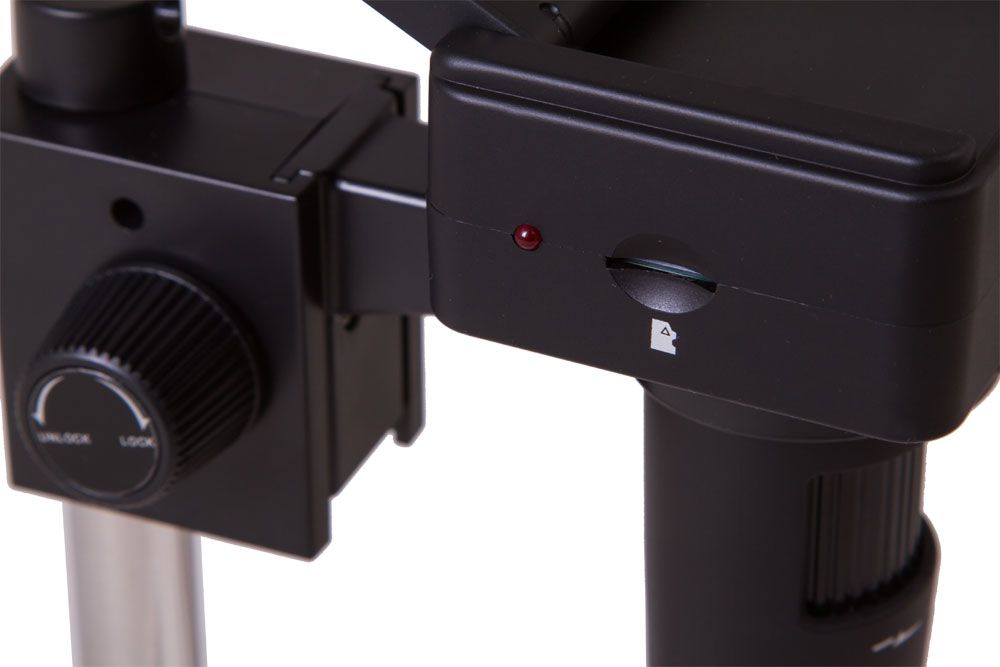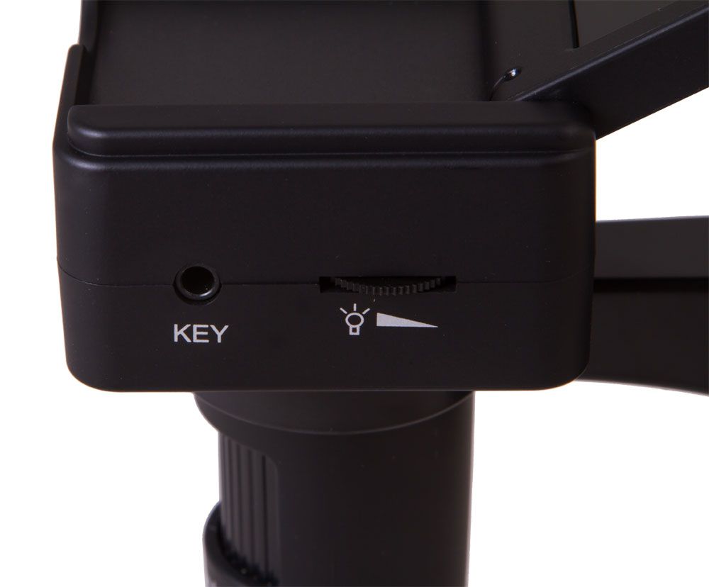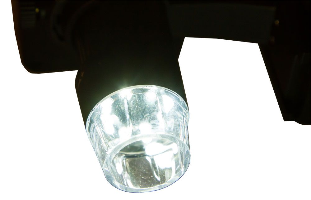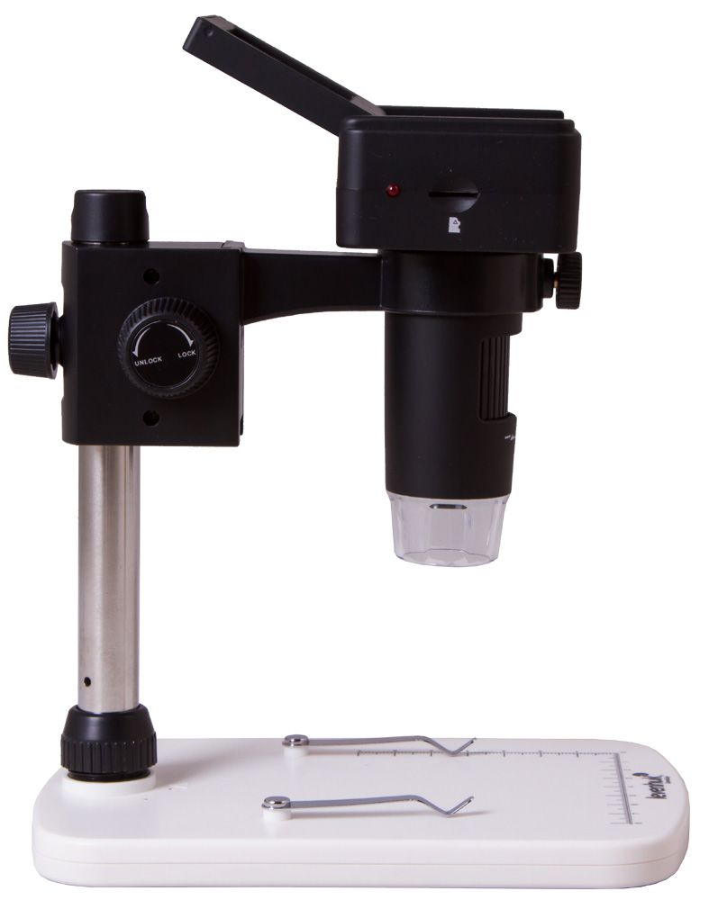 Объектив микроскопа сделан из оптического стекла, поэтому он передает четкое и ясное изображение. Оптическая система дает увеличение в диапазоне от 100 до 220 крат. Кратность наблюдения выбирается вручную. Для настройки резкости используется ручка фокусировки – вращая ее, микроскоп можно перемещать по вертикали, приближая или отдаляя объектив от предметного столика. На предметный столик нанесены измерительные шкалы, образцы удобно фиксировать с помощью металлических препаратодержателей. Светодиодная подсветка расположена сверху, ее яркость легко регулировать.