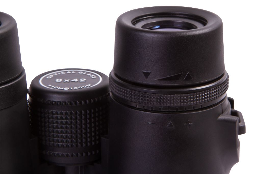 Оптика строится на базе компактных roof-призм и линз, сделанных из стекла BK-7. Оптические поверхности многократно просветлены, поэтому бинокль передает яркую и ясную картинку даже при слабой освещенности. Цветопередача естественная, а контрастность высокая. Резкость регулируется при помощи центрального барабана фокусировки, а диоптрийная коррекция помогает адаптировать оптику под требования наблюдателя с неидеальным зрением. Положение поворотно-выдвижных наглазников можно менять.