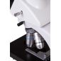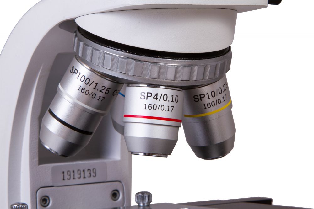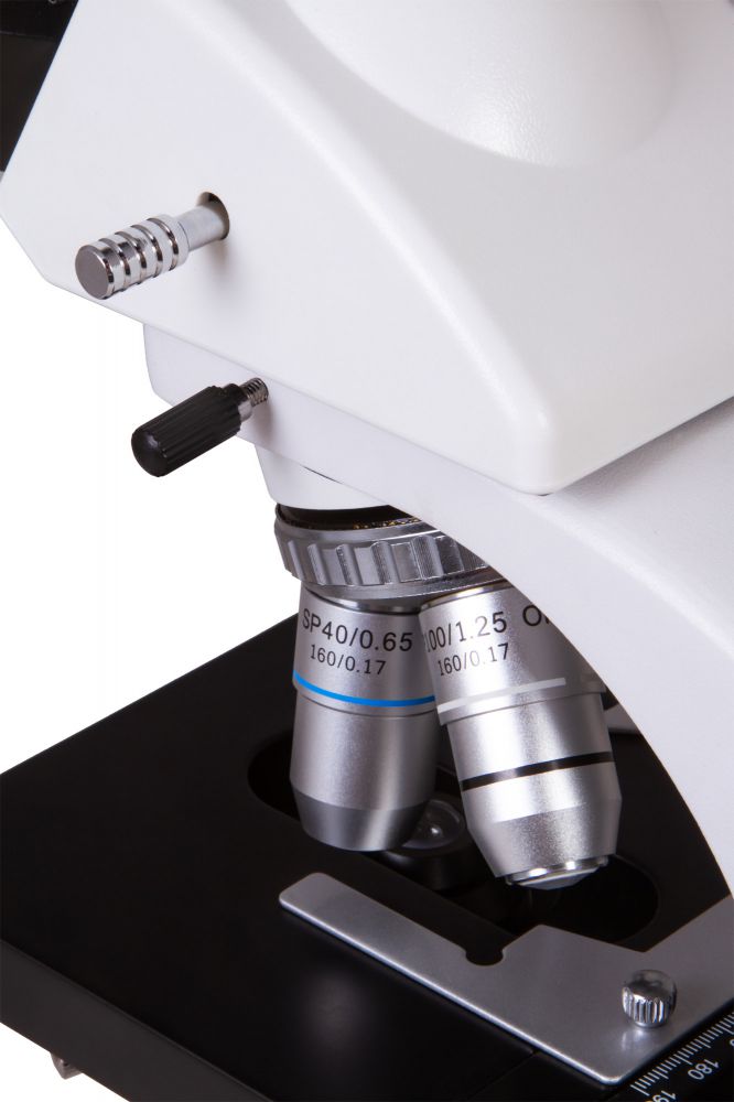 Тринокулярная насадка вращается на 360°. Ее бинокулярная визуальная часть отклонена на 30°. Есть делитель светового потока. В вертикальную трубку устанавливается цифровая камера. Широкопольные окуляры дают хороший обзор и позволяют корректировать диоптрии. Объективы дают разные увеличения, 40-кратный и 100-кратный объективы имеют защитные пружинящие оправы, на максимальном увеличении можно вести наблюдения с применением масляной иммерсии (флакон с маслом в комплекте). Оптика защищена антигрибковым покрытием.