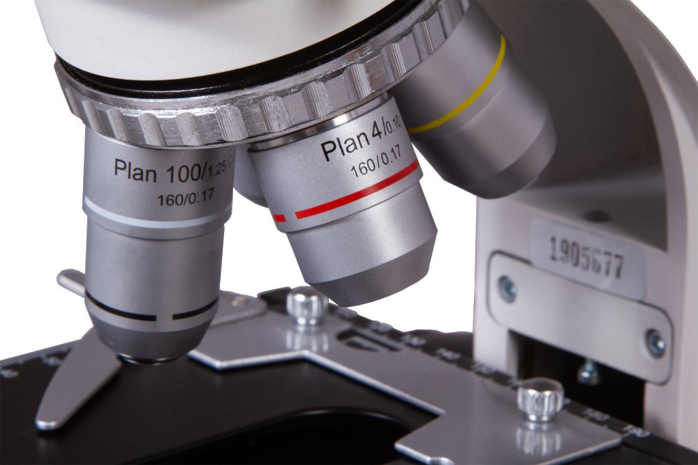 В микроскопе используются планахроматические объективы, которые создают практически идеально плоское поле и убирают хроматизм. Объективы с увеличением 40х и 100х снабжены защитными пружинящими оправами. Кроме того, 100-кратный объектив можно применять для масляной иммерсии. Окуляры широкопольные, с диоптрийной коррекцией. Оба дают 10-кратное увеличение. И объективы, и окуляры имеют защитное антигрибковое покрытие.