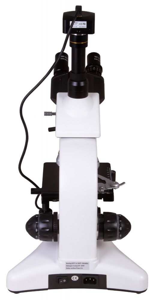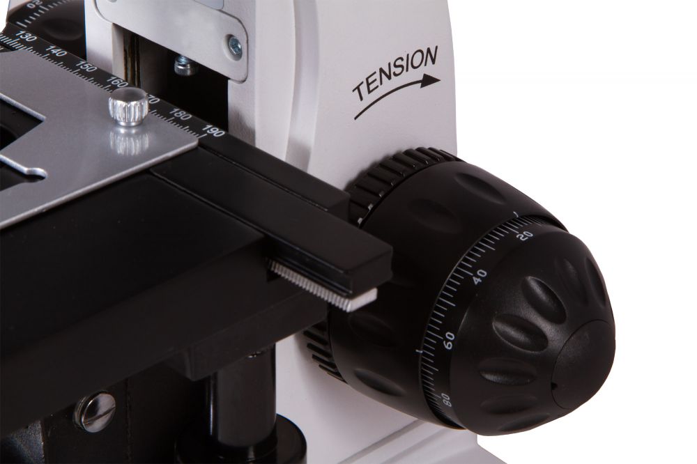 Предметный столик снабжен препаратоводителем. Настройка резкости производится ручками грубой и точной фокусировки. Конденсор Аббе снабжен ирисовой диафрагмой и держателем фильтра. В комплекте есть и темнопольный масляный конденсор для ведения наблюдений методом темного поля. Источником освещения выступает 20-ваттная галогенная лампочка, яркость которой можно регулировать. Есть возможность настройки освещения по Келеру. Для питания подсветки используется сеть переменного тока.