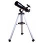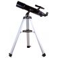 Линзы телескопа сделаны из стекла. Внешние поверхности защищены слоем просветляющего покрытия, которое улучшает яркость изображения. Оптика передает четкую и контрастную картинку и позволяет изучать даже тусклые объекты звездного неба. Телескоп установлен на простую в использовании азимутальную монтировку. Управлять им сможет даже ребенок, чтобы направить оптическую трубу в нужную сторону, достаточно лишь повернуть ее по горизонтали или вертикали. Монтировка фиксируется на алюминиевой треноге. Она прочная, надежная и устойчивая. Высоту ножек треноги можно регулировать. Есть лоток для аксессуаров.