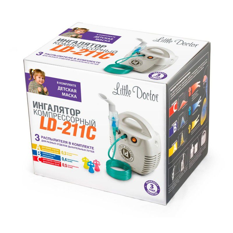 Компрессорный ингалятор LD-211C - это современный компактный медицинский прибор, предназначенный для лечения и профилактики заболеваний дыхательных путей и легких путем вдыхания лекарственных препаратов. Прибор может быть использован всеми членами семьи, включая детей, независимо от их возраста. Во время ингаляции можно целенаправленно воздействовать лечение на определённые участки дыхательных путей при помощи сменных распылителей разного цвета. Распылитель A (желтого цвета) - размер частиц составляет 5,0 мкм и предназначен преимущественно для нижних отделов дыхательной системы. Распылитель B - универсальный (синего цвета), размер частиц составляет 4,0 мкм и предназначен для всех отделов дыхательной системы. Распылитель C (красного цвета) - размер частиц составляет 3,5 мкм и предназначен преимущественно для верхних отделов дыхательной системы. Благодаря специальной камере, которая активирует подачу аэрозоля при вдохе, и снижает концентрацию при выдохе, расход лекарств существенно снижается, что позволяет экономить дорогостоящие препараты.