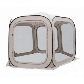 Дверь тамбура дублируется противомоскитной сеткой, обеспечивающей защиту от насекомых. Дверные и сеточные створки могут быть частично или полностью открыты и зафиксированы по бокам клевантами. По всему внутреннему периметру тамбура встроена внутренняя юбка шириной 10 см, обеспечивающая защиту нижней части от ветра и формирующая герметичный порог зоны входа. В боковые стенки тамбура встроены внешние ветрозащитные юбки шириной 20 см, фиксация которых эффективна для защиты от ветра и осадков. По бокам входа изнутри установлены два съемных кармашка для мелких предметов.