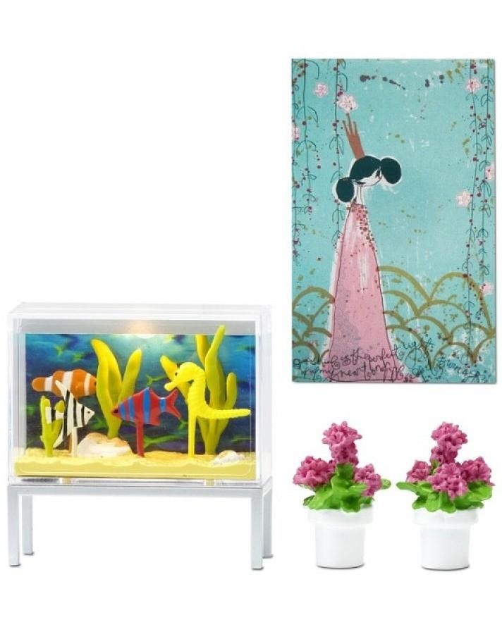 Аксессуары для домика Lundby Смоланд "Аквариум и декор" способны украсить интерьер любой гостиной в кукольном домике. В представленный набор входит копия эксклюзивной картины, созданной шведской художницей специально для компании Lundby, два цветущих растения в белых горшках и очень красивый аквариум с подсветкой.