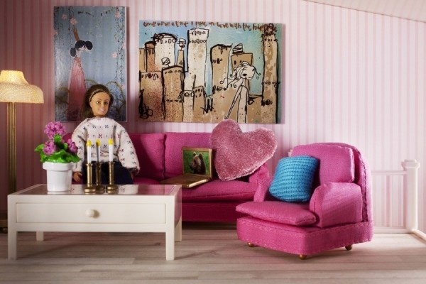 Иметь такую гостиную в доме – настоящая роскошь. Яркий, насыщенный цвет мягкой мебели, а также изысканный журнальный столик будут прекрасно смотреться на бежевом ковре с высоким ворсом, поэтому вашим куклам будет не стыдно пригласить друзей к себе в гости.