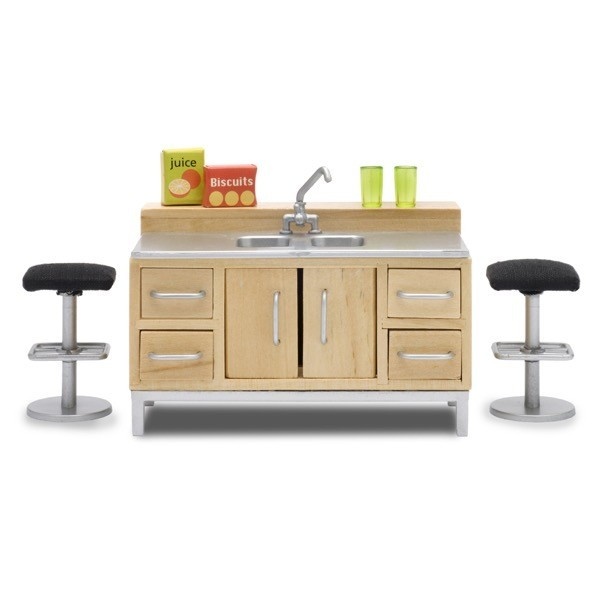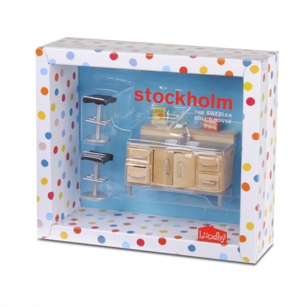Обустроить интерьер кукольного домика по всем правилам комфорта и стиля поможет набор мебели Lundby Стокгольм. Это очень практичный предмет кухонной обстановки классического норвежского кукольного домика. Набор включает в себя стол с моечной поверхностью с раковиной и системой хранения, выполненный в единой конструкции с небольшой барной стойкой. В комплект входят два барных стула, чтобы куклам и их веселым гостям было удобно расположиться для праздничного чаепития. Мебель выполнена из качественных материалов, которые не вредят здоровью детей, что подтверждено необходимыми сертификатами.
