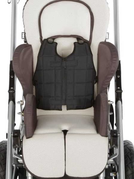 Детскую реабилитационную коляску Кимба Нео можно укомплектовать фиксирующим жилетом, который служит для фиксации туловища в сидении.