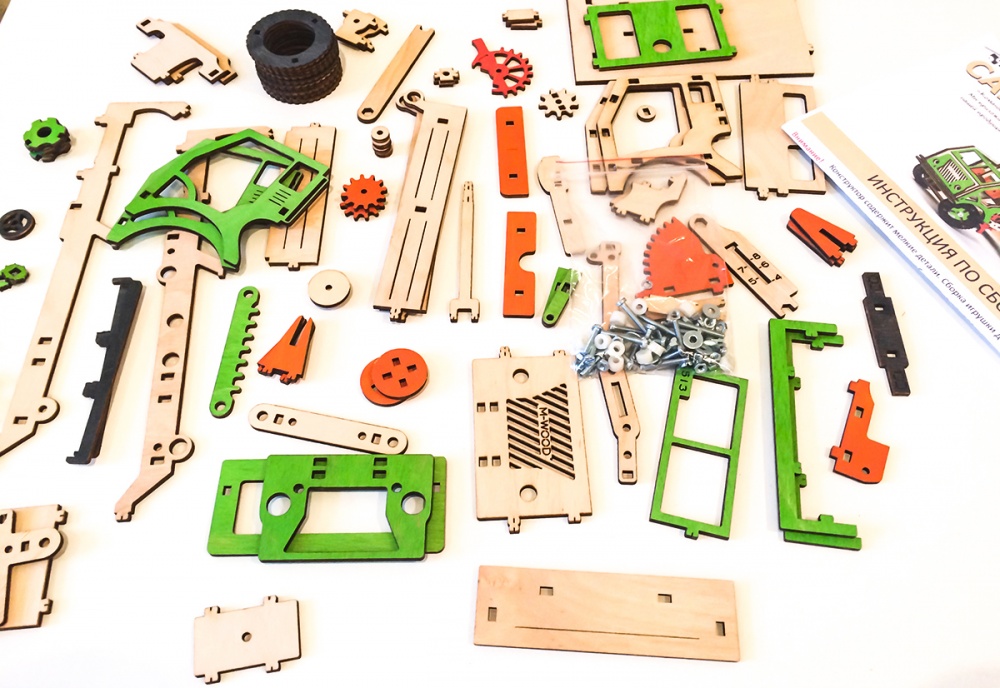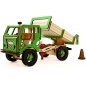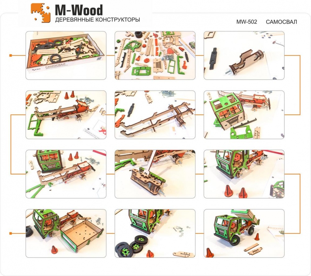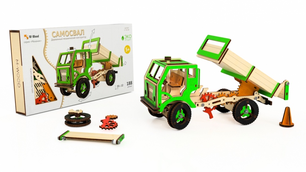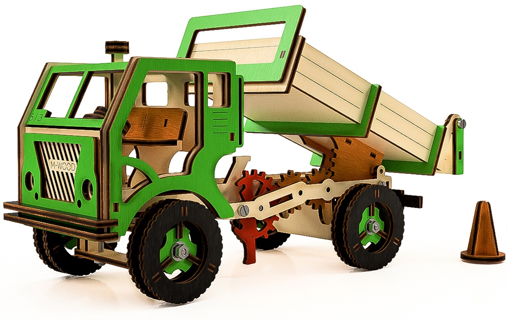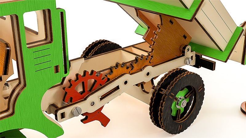 Деревянный самосвал — полноценная игрушка, собранная своими руками. Моделью можно управлять, загружать грузы, перевозить и разгружать. Шестеренки и механизмы делают этот процесс действительно увлекательным. Ручка на крыше служит для поворота передних колес, а также для передвижения модели. Рычаг приводит в действие зубчатый механизм и поднимает кузов. При подъёме кузова, открывается борт.