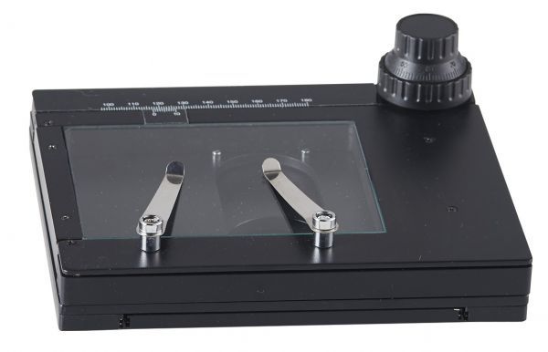 Предметный столик устанавливается на основание стереомикроскопа и используется для точного и плавного позиционирования образца под объективом при визуальных наблюдениях и документировании с помощью камеры. Вращение коаксиальных рукояток перемещает образец по осям X (вправо-влево) и Y (вперед-назад). Стеклянная прозрачная поверхность столика позволяет работать в отраженном и проходящем свете. Измерительная шкала с нониусом для измерения по одной оси. Для фиксации плоских объектов на столике два прижима.