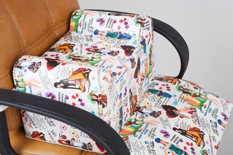 Детское сиденье Bambini Fashion устанавливается на парикмахерское кресло. Специальная конструкция позволяет с комфортом разместить малыша, а его ножки не испачкают взрослое кресло: для этого предусмотрена мягкая накладка-подножка. Благодаря высокому качеству экокожи и качественной прострочке кресло прослужит вам очень долго. Специальный наполнитель повышенной плотности не проминается даже под большой нагрузкой. Форма детского сиденья обтекаема и оформлена веселыми рисунками.