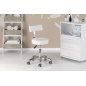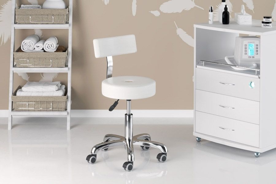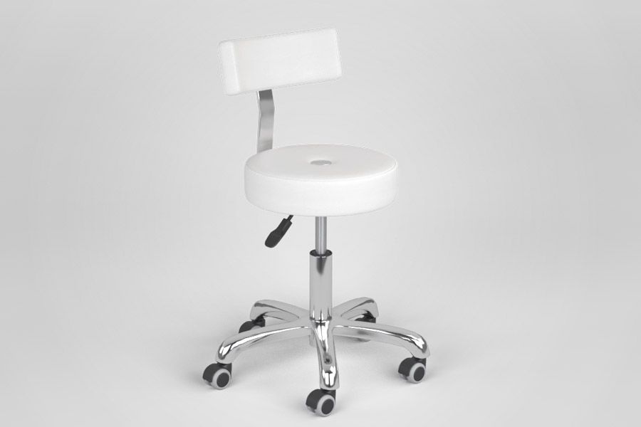Стул мастера Romano подходит для использования в косметологических кабинетах и салонах ногтевого сервиса. Стул имеет комфортную дугообразную спинку и пневматический подъемник, рычаг которого расположен под сиденьем. Конструкция установлена на хромированном основании с бесшумными прорезиненными колесами.
