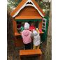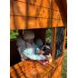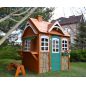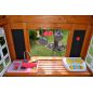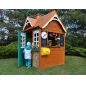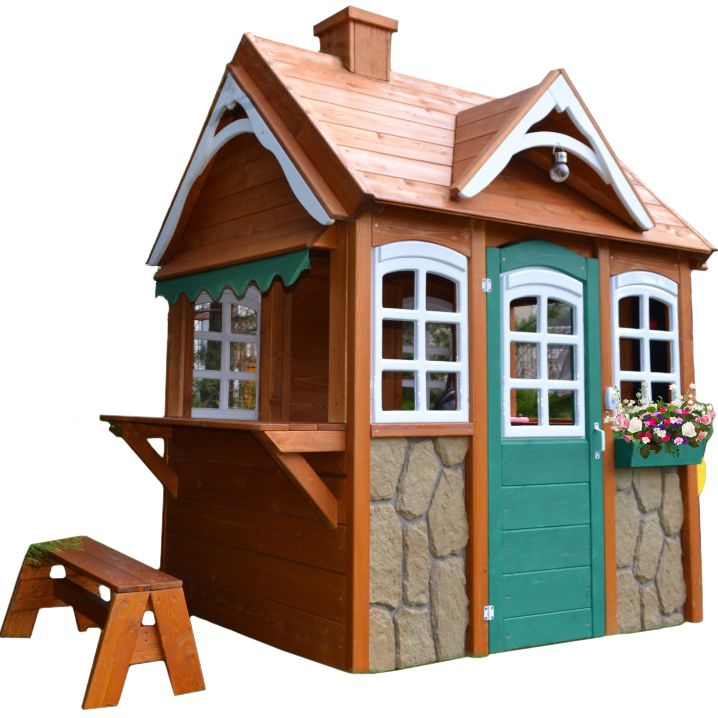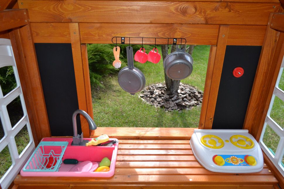 Часы снаружи домика позволяют детям устанавливать собственное время. В домике есть кухня - раковина и плита с конфорками, а также набор посуды для приготовления еды. Раковина с подачей воды (насос).