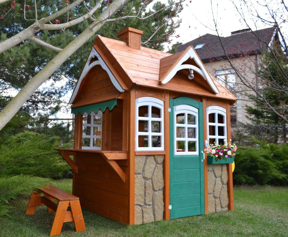 Большой уличный домик дает больше возможностей для увлекательной игры. Конструктивно он представляет собой коттедж с двускатной крышей, дверью, окнами,столиком, лавочкой и дополнительными игровыми возможностями.