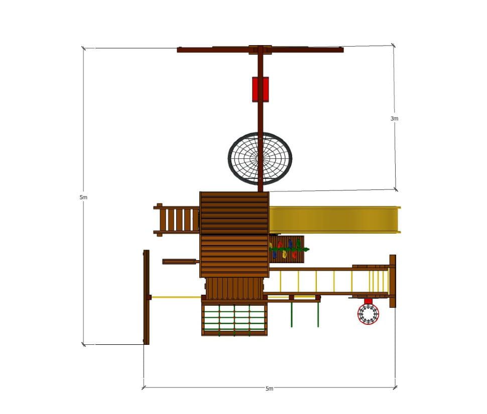 Главными особенностями данной модели являются домик на первом этаже башни, дополнительный модуль "Турник", поручни на шведской стенке и "прямая" канатная лестница. Домик станет идеальным дополнением игровой зоны, поможет укрыться от дождя в непогоду, а также палящих солнечных лучей. Здесь нет ничего лишнего и травмоопасного, конструкция смотрится очень эффектно.