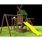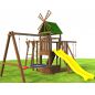 Для малышей есть небольшой домик на нижнем уровне и качели. Одно сиденье прямое, второе выполнено в форме «гнезда» — широкое и прочное оно выдержит значительный вес.