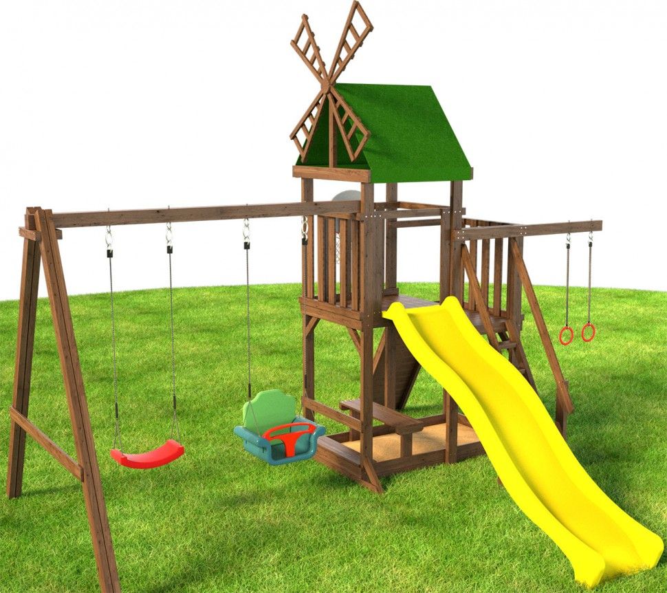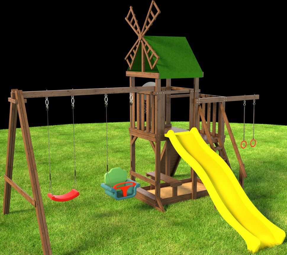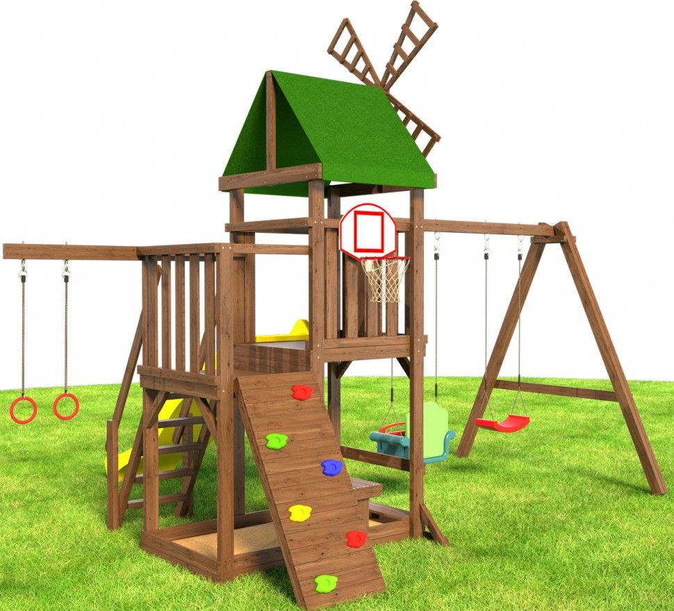 Комплекс изготовлен из карельской сосны 1 сорта. Этот вид древесины не гниет и не трескается под воздействием погодных явлений. Все детали игровой площадки Мельница уют прошли многочисленные циклы шлифования. Окрашивание производилось методом полного окунания.