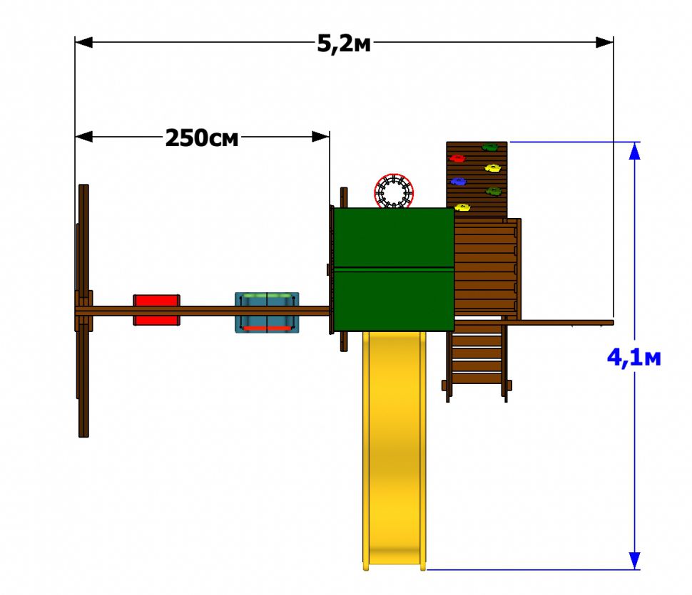 Гимнастические кольца и баскетбольное кольцо развивают меткость, упорство и выносливость. С противоположной стороны от спортивных снарядов расположены качели с 2 сиденьями. Одно предназначено для детей до 3-х лет.