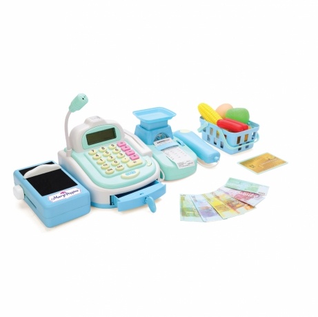 Замечательная игрушка непременно понравится мальчикам и девочкам, которые любят играть в магазин. Дети смогут примерить на себя роль покупателя и кассира, научатся вести конструктивные диалоги, познакомятся с товарно-денежными отношениями. В наборе есть муляжи продуктов, деньги и кассовое оборудование.