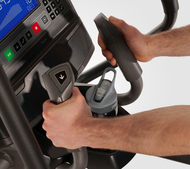 Домашний эллиптический эргометр премиального уровня с электромагнитной (ECB magnetic braking system) системой нагружения и 20 уровнями нагрузки. Компьютер представлен 8.5-дюймовый LCD дисплей с голубой подсветкой, отображающий все основные показатели. Оснащен Bluetooth FTMS-модулем для подключения к сторонним мобильным приложениям.