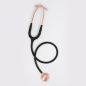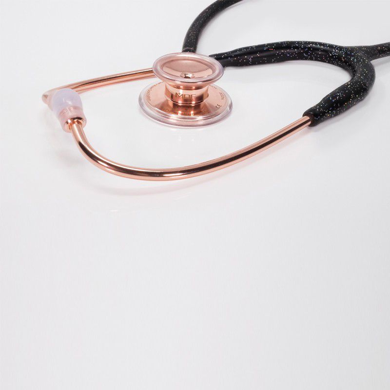 Фонендоскоп из нержавеющей стали с двойной мембранной головкой разного диаметра. Модель изготовлена на высокоточном оборудовании с ручной шлифовкой. Шток поворачивается на 360 градусов, специальный индикатор помогает быстро определить активный колокол. Конструкция обладает высокой акустической передачей. На колоколах имеются комфортные и мягкие уплотнительные кольца из материала, изолирующего посторонние звуки. Металлическая часть - цвета розового золота.