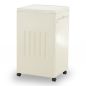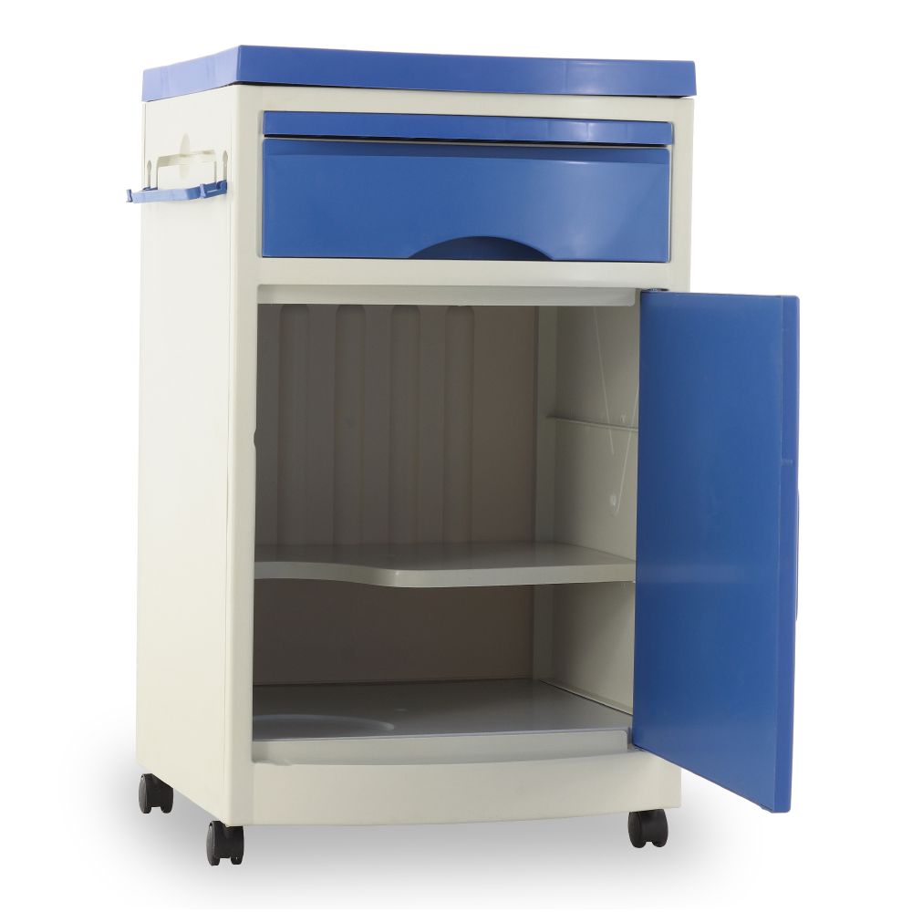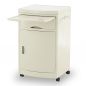Прикроватная тумба оснащена компактным выдвижным столиком, ящиком и отделением с полкой для хранения различных вещей. Для мобильности есть колеса, два из которых имеют стопорные устройства.