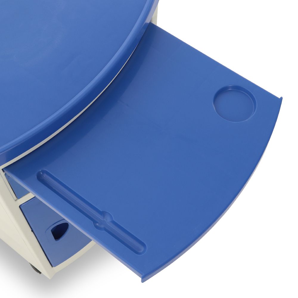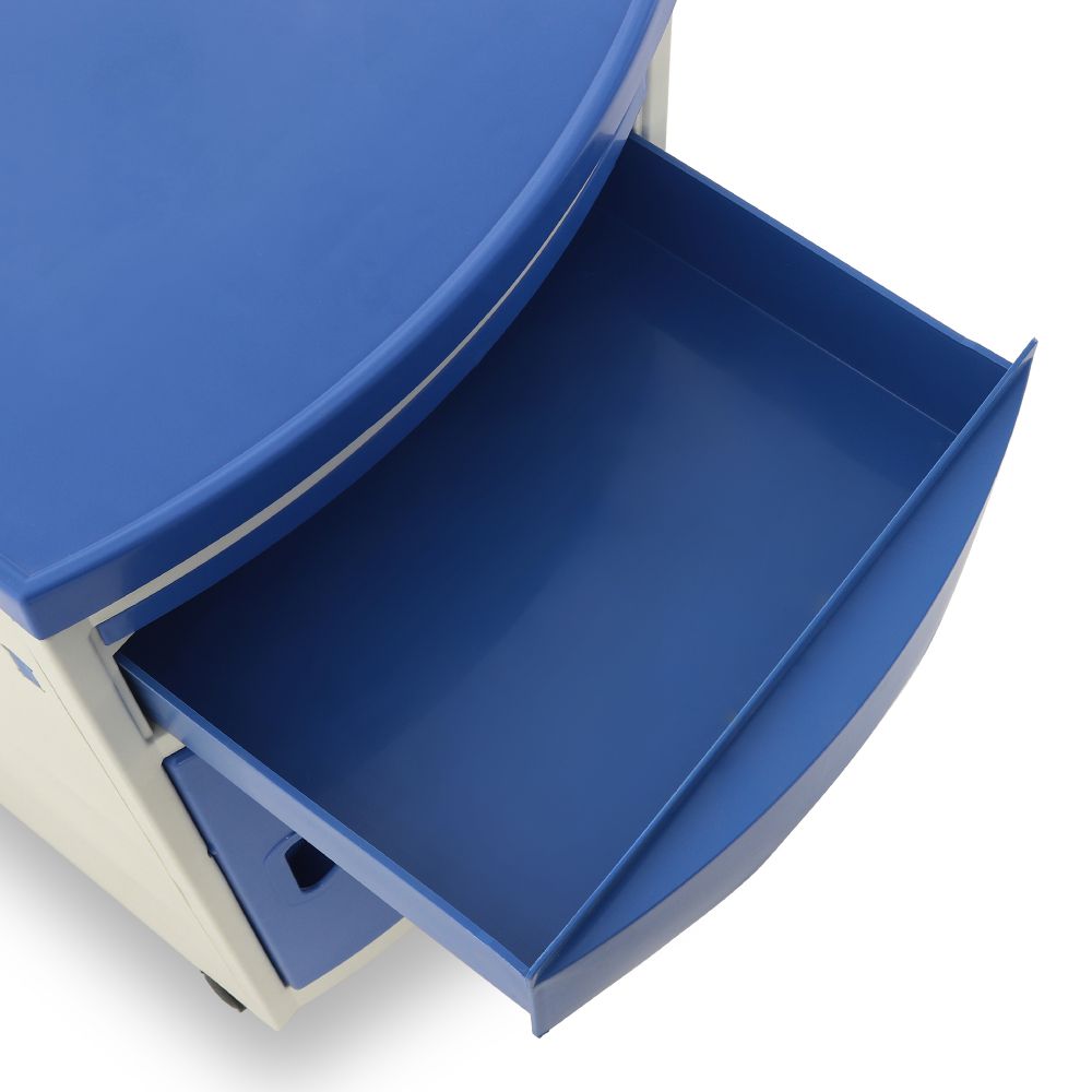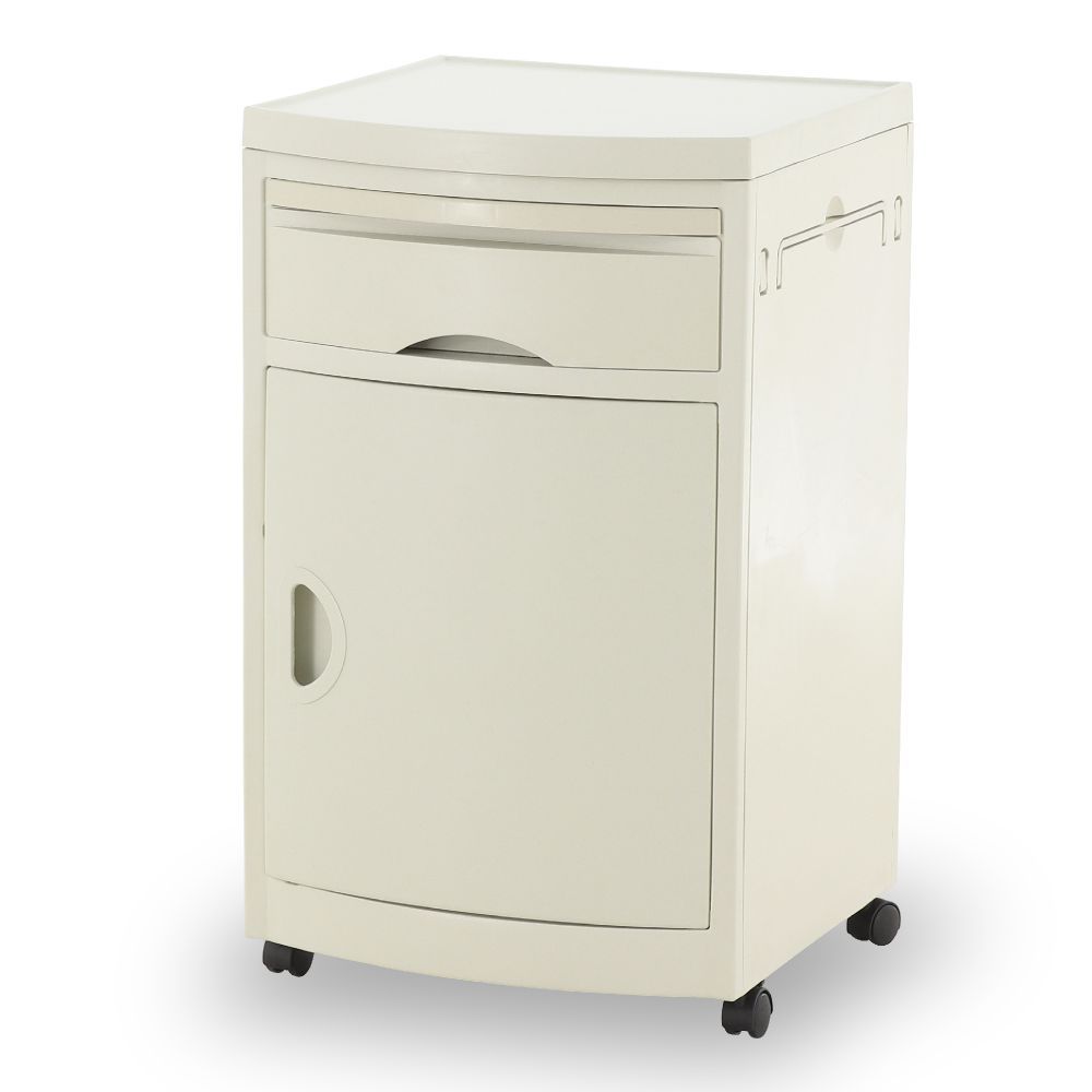 Среди недостатков конструкции – нет возможности регулировки высоты, чтобы подстроить мебель под нестандартную кровать. Также стоит отметить отсутствие выдвижных направляющих на ящике, из –за чего он может случайно выпасть в крайнем положении, если будет неравномерно нагружен. Тумбочка прикроватная на колёсах BLZ 016 с дополнительным выдвижным столиком и скруглённым белым фасадом. Передвижная прикроватная тумбочка на самоориентирующихся двойных роликах, два из которых которых оснащены тормозным устройством. Cнабжена отделением с дверцей и полкой внутри, глубоким выдвижным ящиком и дополнительным выдвижным столиком, убирающимся под топ. Столешница с четырехсторонней выпрессованной отбортовкой. Широкая металлическая ручка сбоку позволяет легко перемещать тумбочку или удобно подвешивать за неё различные аксессуары.