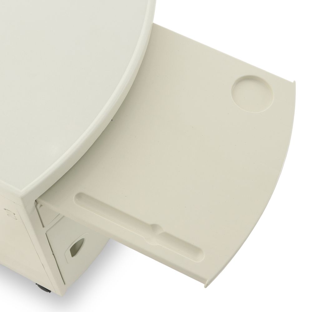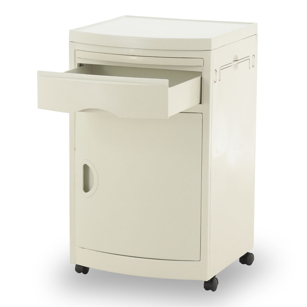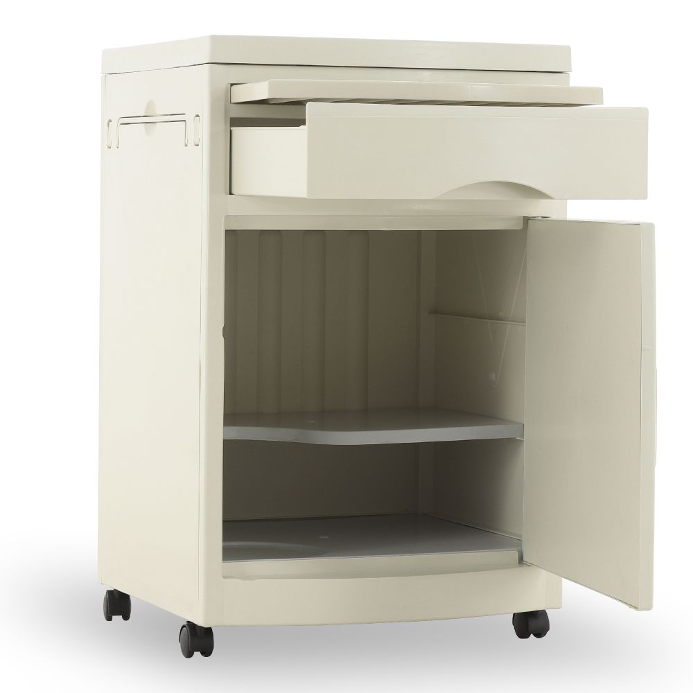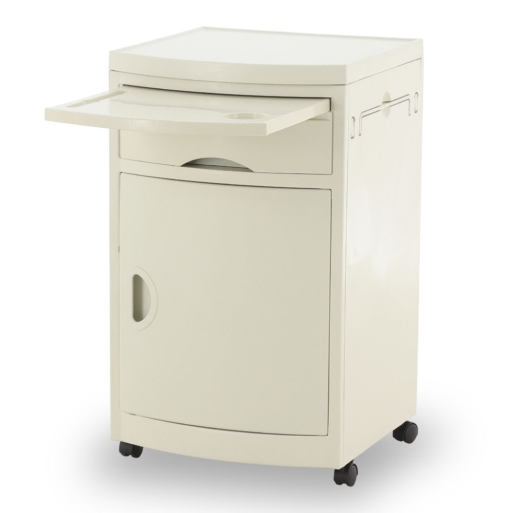 Имеет выдвижной столик, ящик, отделение с дверкой и полкой. Выполнена из высокопрочного ABS-пластика с дополнительным выдвижным столиком и скругленным фасадом. Столешница оборудована бортиком на боковых и на задней стороне. Дополнительный выдвигающийся столик для приема лекарств и углублением под стакан.