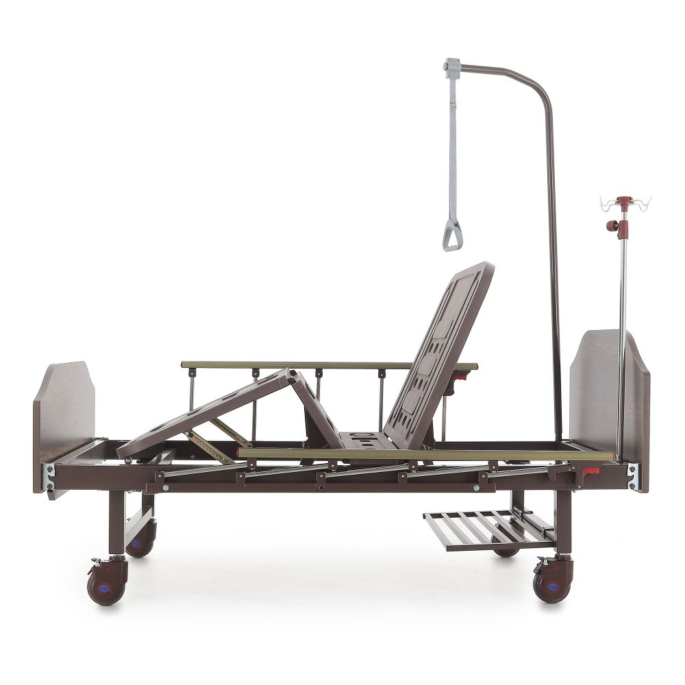Каркас стальной, покрытой защитным антикоррозийным составом. Подвижные секции меняют положение посредством червячного привода. Боковые поручни опускаются до уровня ложа. Торцевые спинки полностью снимаются. В основании кровати предусмотрена съемная полка для установки санитарного устройства.