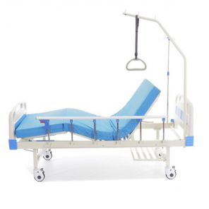 Надёжный металлический каркас кровати выдерживает нагрузку до 250 кг. Все элементы изделия имеют тщательно продуманную, обтекаемую форму для предотвращения случайных травм. Модель оснащена прочными боковыми ограждениями, обеспечивающими дополнительную безопасность пациенту. В нижней части кровати предусмотрена удобная полка для обуви или медицинского судна.