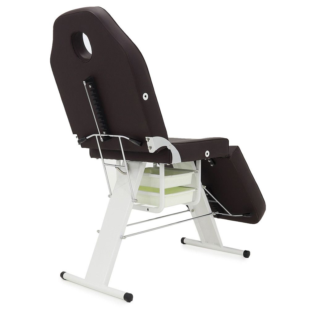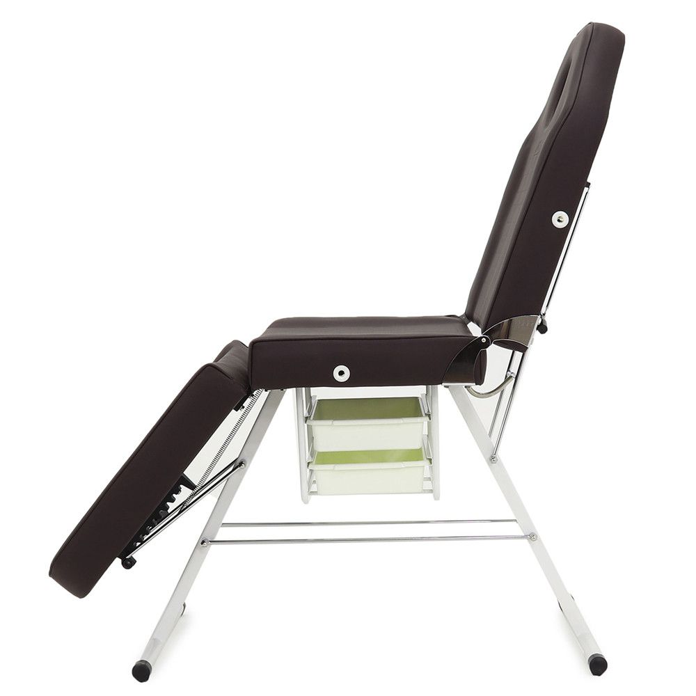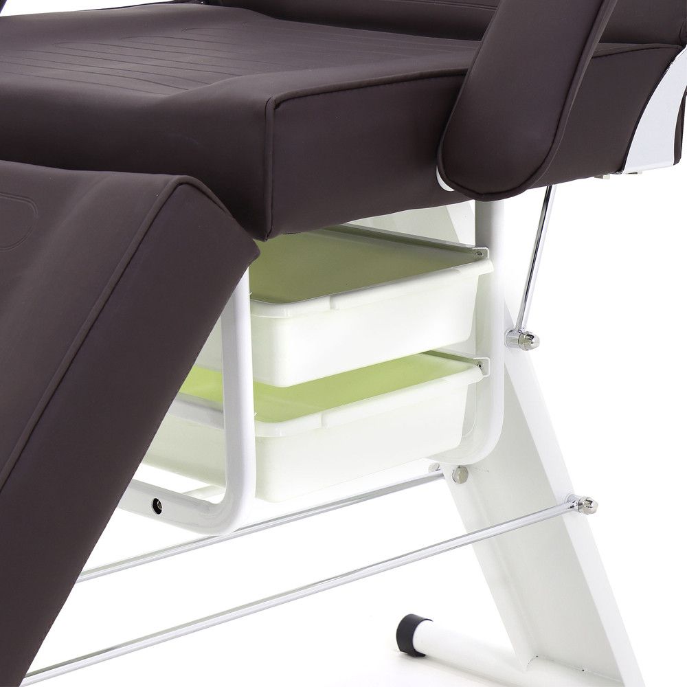 Набор из массажного стола и стула с оригинальной, анатомической формой сидения. Стол стационарный, со стальной рамой, весит 31 килограмм. Он состоит из 3 секций, наклон которых регулируется. Это позволяет легко превратить стол в кресло или шезлонг, использовать его не только для массажа, но и для косметологических процедур.