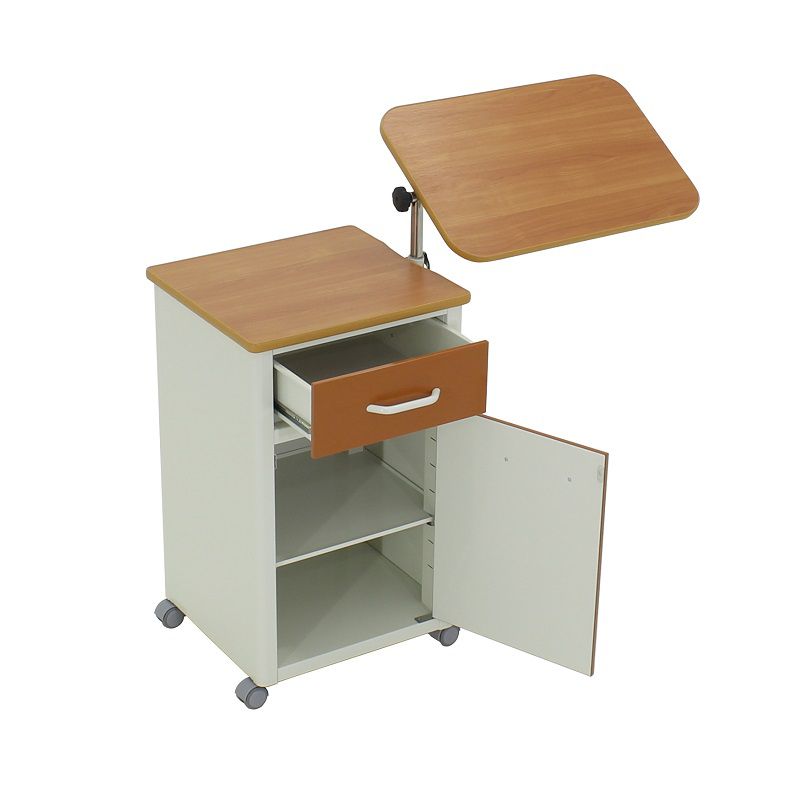 Столешница способна выдерживать нагрузку до пяти килограмм. Также столик укомплектован вместительной тумбочкой и ящиком, что позволит держать под рукой все необходимые вещи. Такая функция необходима не только в работе специалиста, но также и для пациента стационара, которому нужно иметь быстрый доступ до нужных ему вещей.