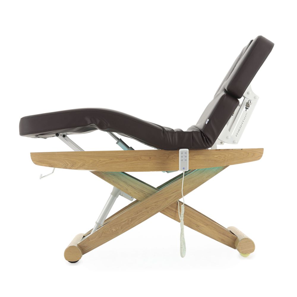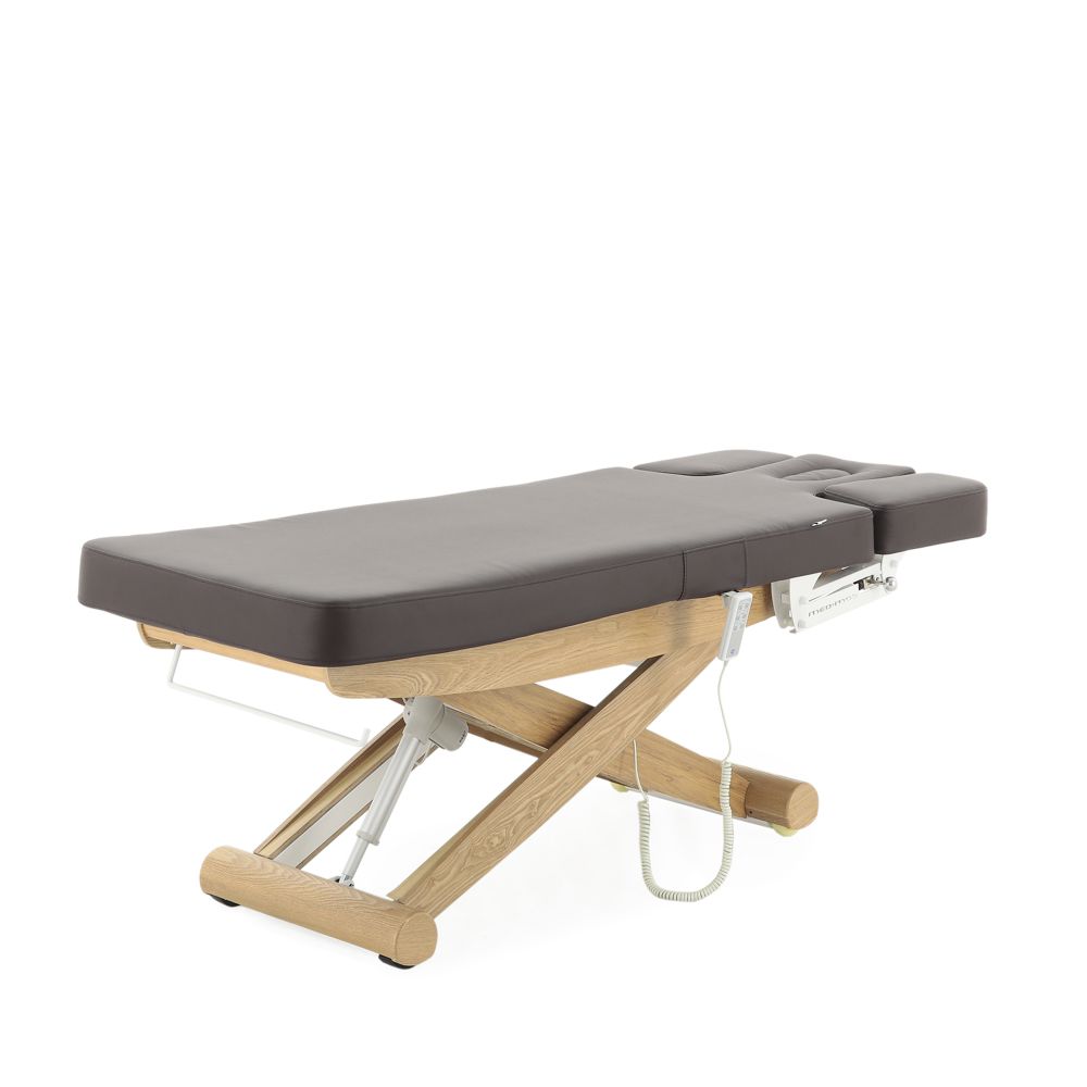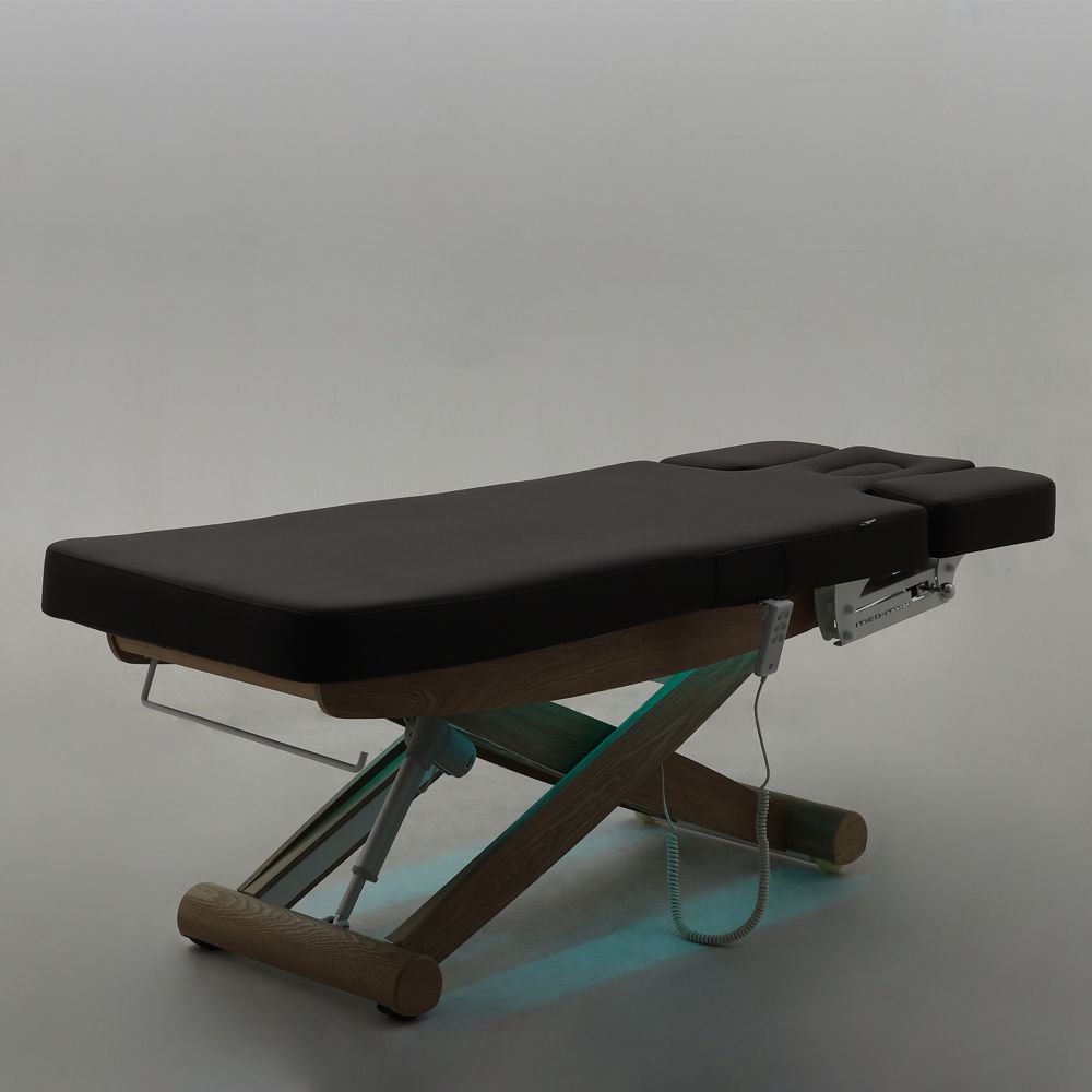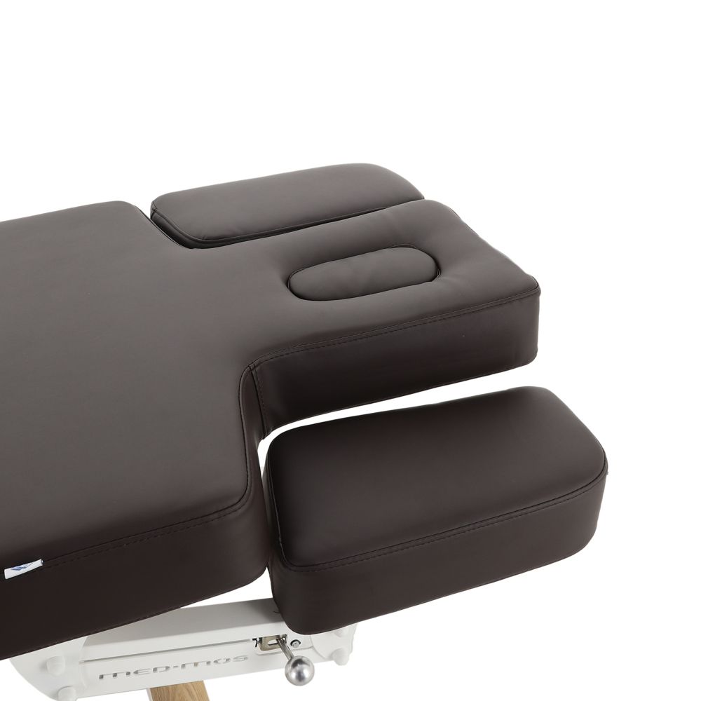Массажный стол электричеcкий Med-Mos ММ-940-2В КО-162Д-00. Основание и рама выполнены из стальных профильных труб, покрытых ударопрочной эпоксидной эмалью. Подъемная рама и приводы подъема секций ложа закрыты декоративными накладками (Пластик, МДФ, шпон).