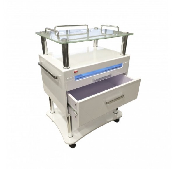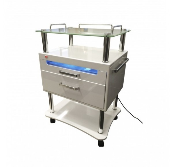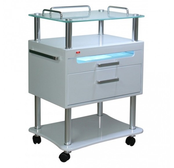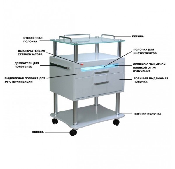 Это новейшая тумба, которая создана с применением передовых технологий, современный дизайн которой удовлетворит даже самый взыскательный вкус. Функциональность данного изделия позволит качественно и комфортабельно производить различные процедуры. Полка из закаленного стекла имеет достаточно места для размещения необходимых инструментов. Выдвижная полка с УФ стерилизатором используется для стерилизации необходимых инструментов, которые не являются термостойкими. Ионизация помещения производится ультрафиолетовым излучением. Лоток для инструментов изготовлен из высококачественного пластика, в соответствии со всеми требованиями для безопасного использования. Окошко, в выдвижной полке УФ стерилизатора, имеет пленку, защищающую глаза пользователя от УФ излучения. Полка с УФ стерилизатором имеет защитную систему, которая останавливает работу УФ стерилизатора автоматически при открывании данной полки.