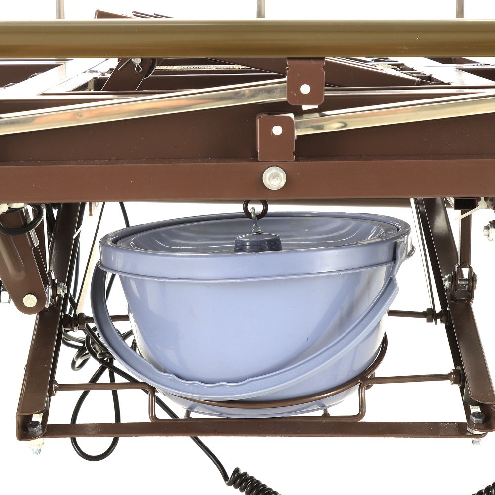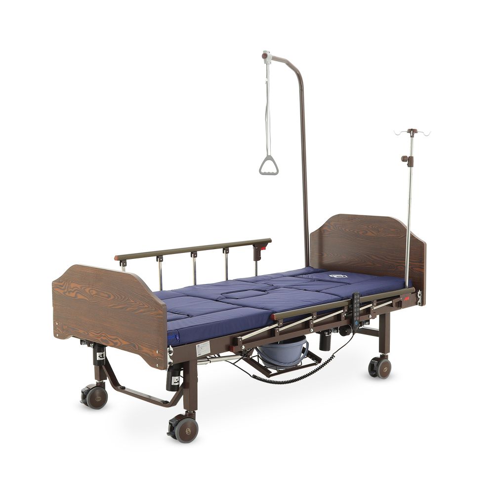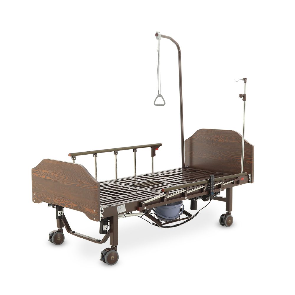 Кровать электрическая YG-3 (МЕ-5528Н-02) ЛДСП Венге с боковым переворачиванием, туалетным устройством и судном с крышкой, функцией «кардиокресло». Электропривод с пультом управления позволяет регулировать наклон секций как ухаживающим, так и самому пациенту. В случае отсутствия электропитания привод кровати переходит в ручной режим.