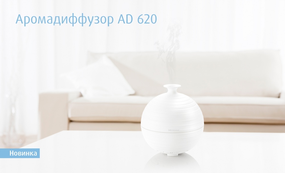 Аромадиффузор Medisana AD 620 наполнит помещение вашим любимым ароматом, создаст уютную и теплую атмосферу, поможет расслабиться после трудного рабочего дня. Установите диффузор, где это удобно в гостиной или спальне, ванной комнате или туалете — он универсален и очень прост в использовании.