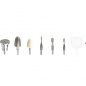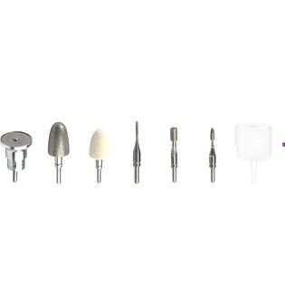 В комплект входят следующие насадки - войлочный конус, сапфировый диск мелкозернистый, цилиндрический бор, бор в форме пламени, игольчатый бор, сапфировый конус длинный и крупнозернистый, насадка с покрытием из наждачной бумаги - подходит для удаления сухой и ороговевшей кожи, мозолей на подошвах и пятках, а также для обработки ногтей.