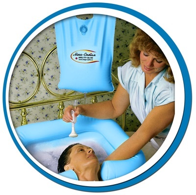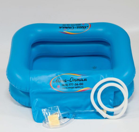 Надувная ванночка используется для мытья головы у лежачих больных. Сама чаша имеет прямоугольную форму с характерной выемкой спереди для обеспечения удобного положения головы. В комплект поставки входит емкость для воды с душевой лейкой.
