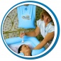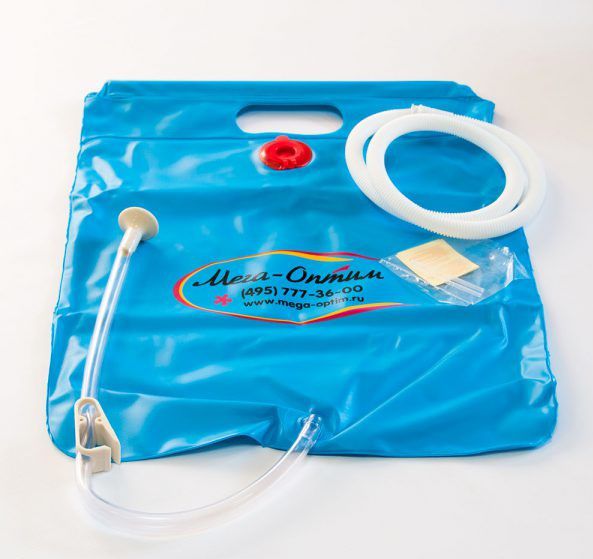 В комплект входит емкость для воды на 10 литров, оборудованная шлангом с душевой лейкой. Зажим на шланге позволяет управлять потоком воды из емкости. Ко дну ванночки также подсоединяется сливной шланг, что позволяет сливать воду сразу после водных процедур.