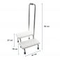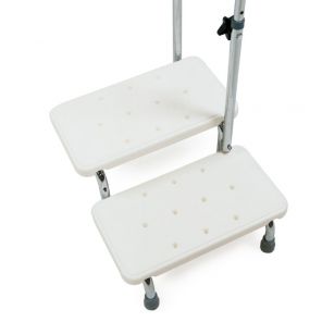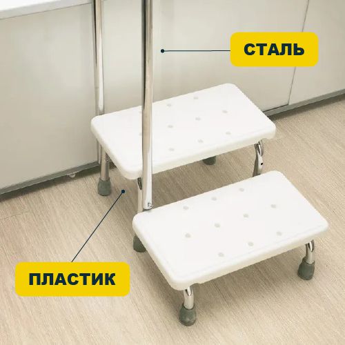 Два уровня ступеней имеют отверстия для стока воды. Пластиковые ступени выдерживают 125 кг, легко моются и нейтральны к воздействию концентрированных санитарных средств. На ножки устройства надеты наконечники, обеспечивающие устойчивость конструкции.