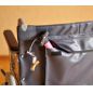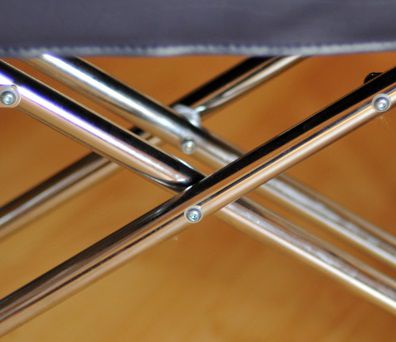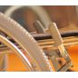 Подлокотники коляски удобные с накладками, подножки регулируются по оси и откидываются. Для безопасности оборудование оснащено стояночными тормозами. Обивка коляски в области спинки и сиденья выполнены из плотного и водонепроницаемого материала, есть тканевая опора для голеней. Каркас легко складывается, что обеспечивает удобное хранение и транспортировку коляски.