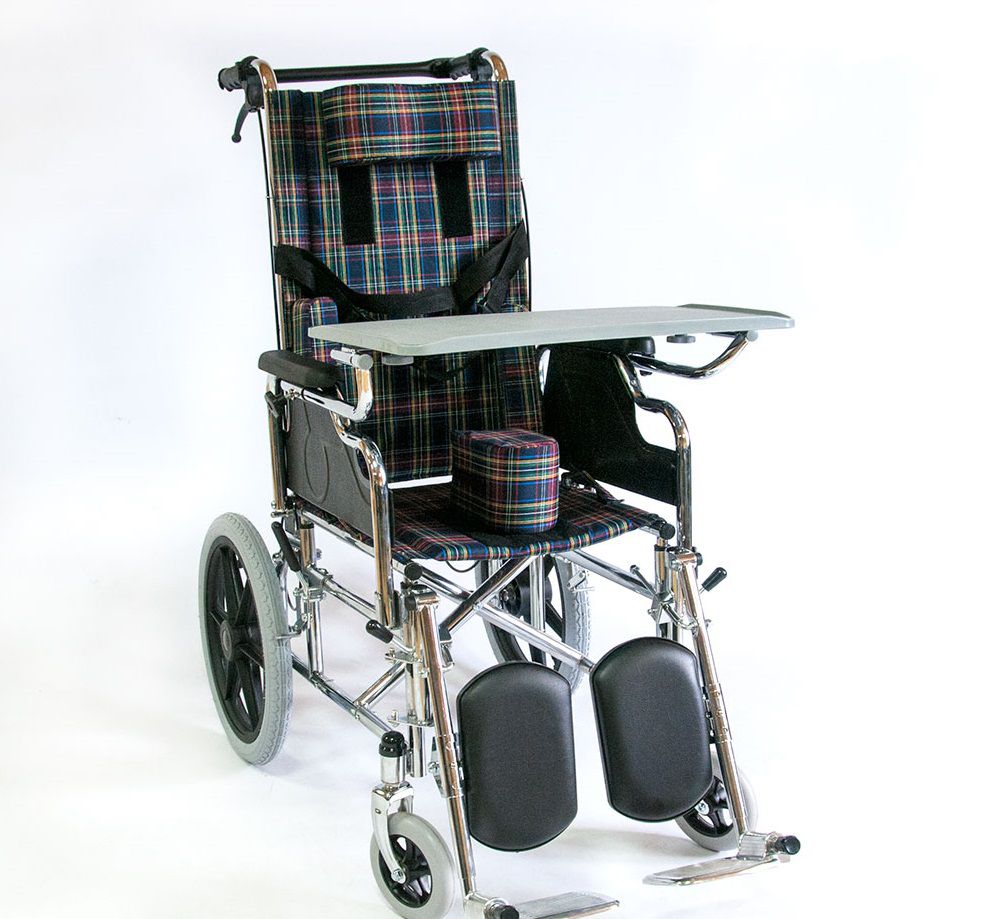 Конструкция складная, рама выполнена из стали с хромовым покрытием. коляска оборудована откидными подлокотниками с мягкими накладками, съемным столиком. Абдуктор, подголовник и боковые фиксаторы для туловища крепятся к креслу с помощью липучек.